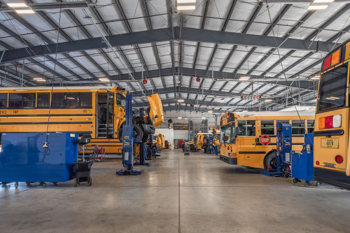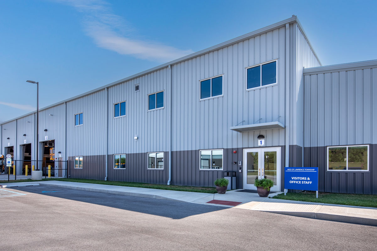 Powers & Sons completed construction of a new 42,250-square-foot transportation center for MSD of Lawrence Township. Located on a 33-acre site, the facility includes a 10-bay pre-engineered metal building designed to expand transportation services. The site accommodates up to 250 buses and 200 vehicles, improving operational capacity. Interior spaces feature offices, conference rooms, restrooms, training areas, and support buildings for equipment storage.